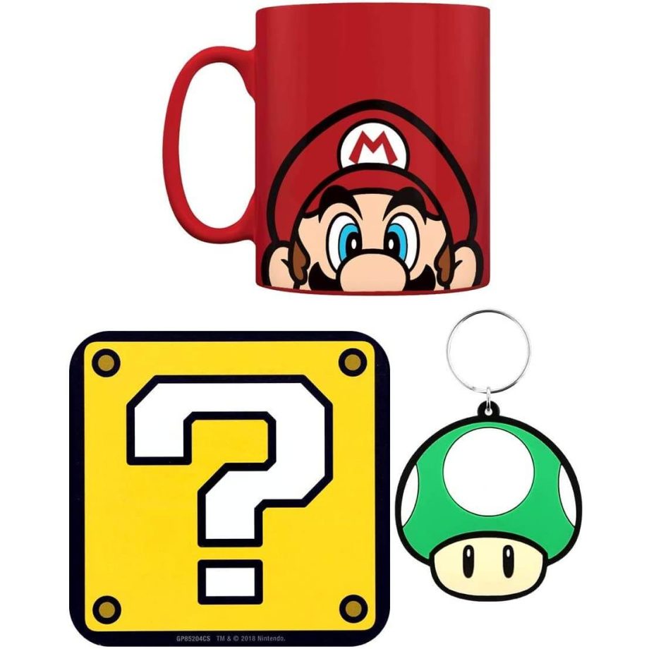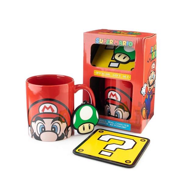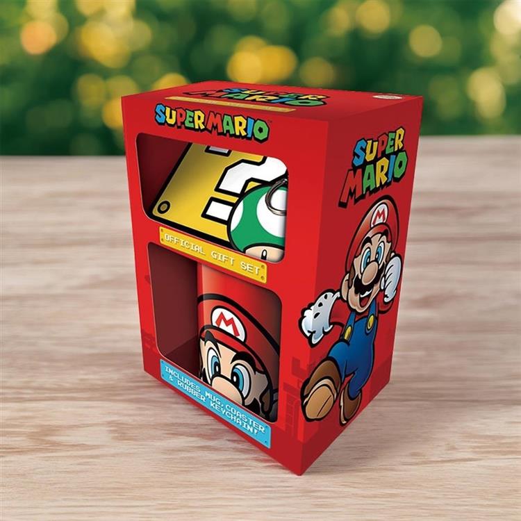 在煩惱送禮要送什麼嗎?選擇這款超級瑪利歐禮物組將解決你一切的問題。內容物有瑪莉歐馬克杯、問號磚塊杯墊、綠色蘑菇鑰匙圈。非常適合當作生日禮物送給喜愛遊戲的朋友們,當然買來自己使用也是完全沒有問題的啦!馬克杯容量約為315ml。