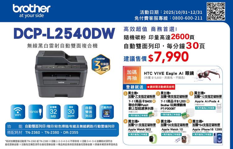 (機+粉)Brother HL-L2540DW+TN-2360 超值組→點我進入