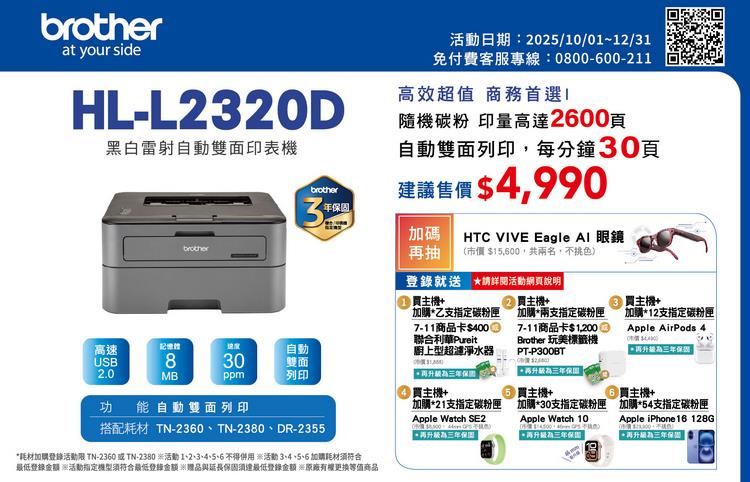 (機+粉)Brother HL-L2320D 高速黑白雷射自動雙面印表機+TN-2360原廠碳粉匣