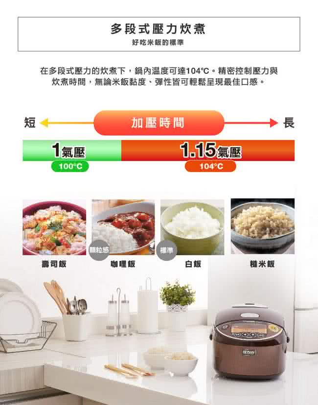 (1) 多段式壓力(1.0-1.15氣壓)炊煮,可選擇喜愛口感,滿足挑易味蕾。