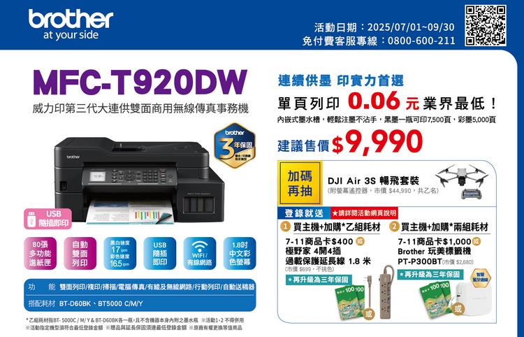 Brother MFC-T920DW 威力印大連供雙面商用無線傳真事務機