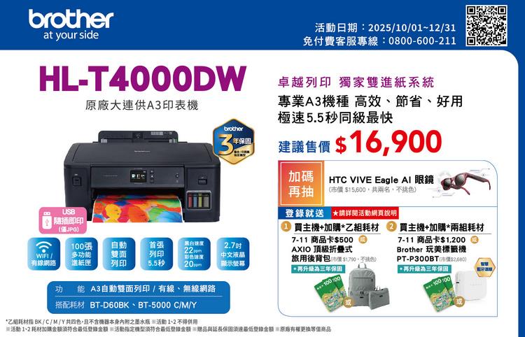 【墨水7折】Brother HL-T4000DW原廠大連供A3印表機+1黑3彩墨水組(1組)