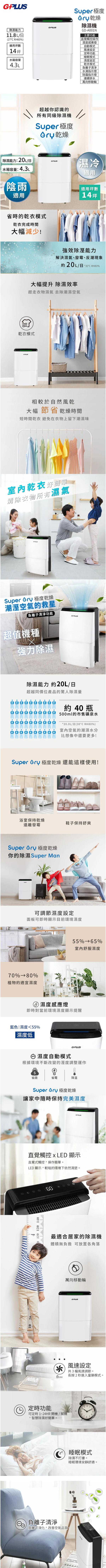 ◎支援負離子、濕度燈號顯示、自動除濕、乾衣模式、睡眠模式、滿水自動停止、連續排水、停電自動記憶、操控面板(觸控)