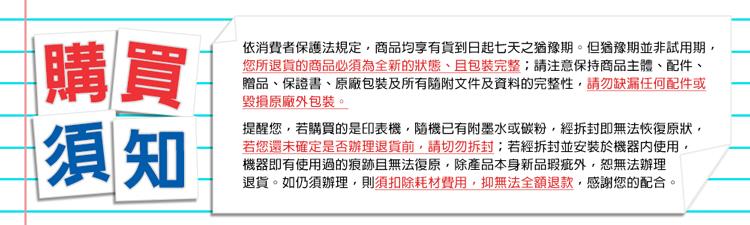 • 辦理退換貨時,商品(組合商品恕無法接受單獨退貨)必須是您收到商品時的原始狀態(包含商品本體、配件、贈品、保證書、所有附隨資料文件及原廠內外包裝…等),請勿直接使用原廠包裝寄送,或於原廠包裝上黏貼紙張或書寫文字。