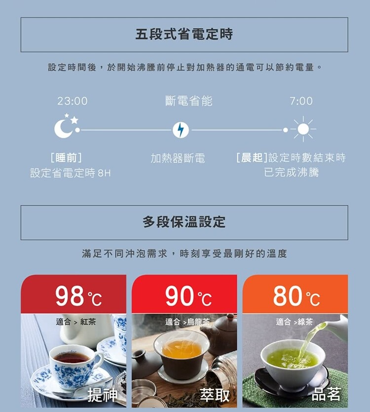 98℃、90℃、80℃、70℃、60℃「5段保温設定」,適合各種茶葉沖泡温度