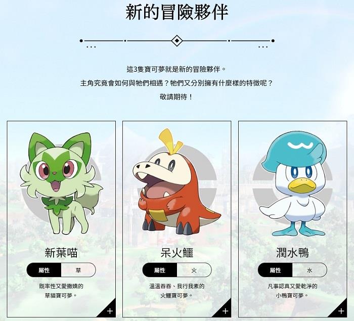您最初的夥伴,是草屬性的「新葉喵」、火屬性的「呆火鱷」和水屬性的「潤水鴨」3隻的其中之一。