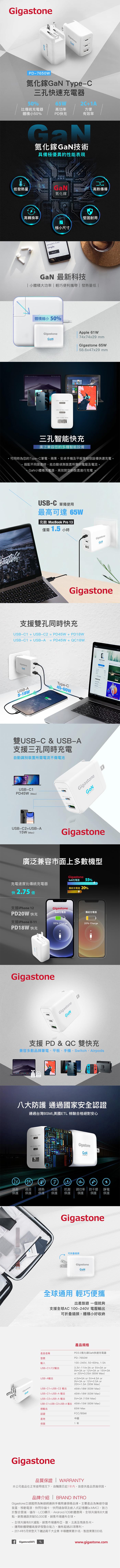 【Gigastone】PD/QC3.0 65W 氮化鎵GaN 三孔快速充電器(PD-7650W)
