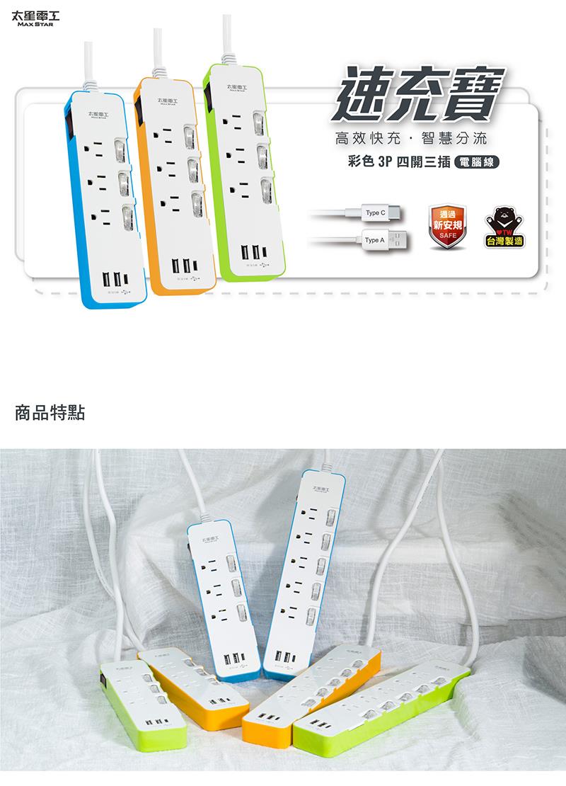 【太星電工】速充寶彩色3.4A 3USB 四開三插電腦線3P/6尺(顏色任選) OCV43306