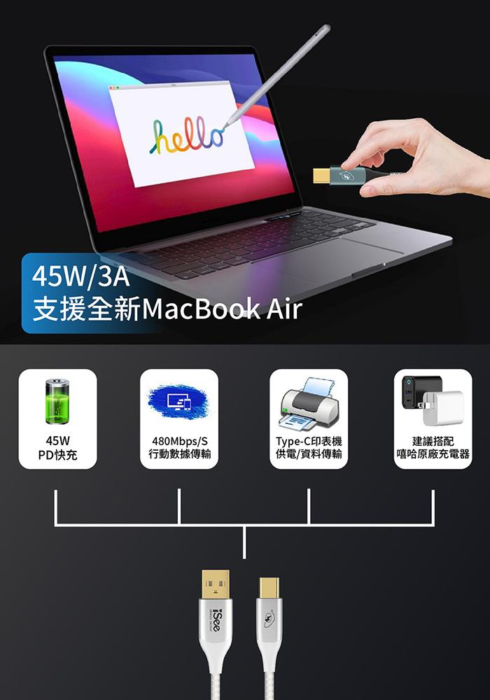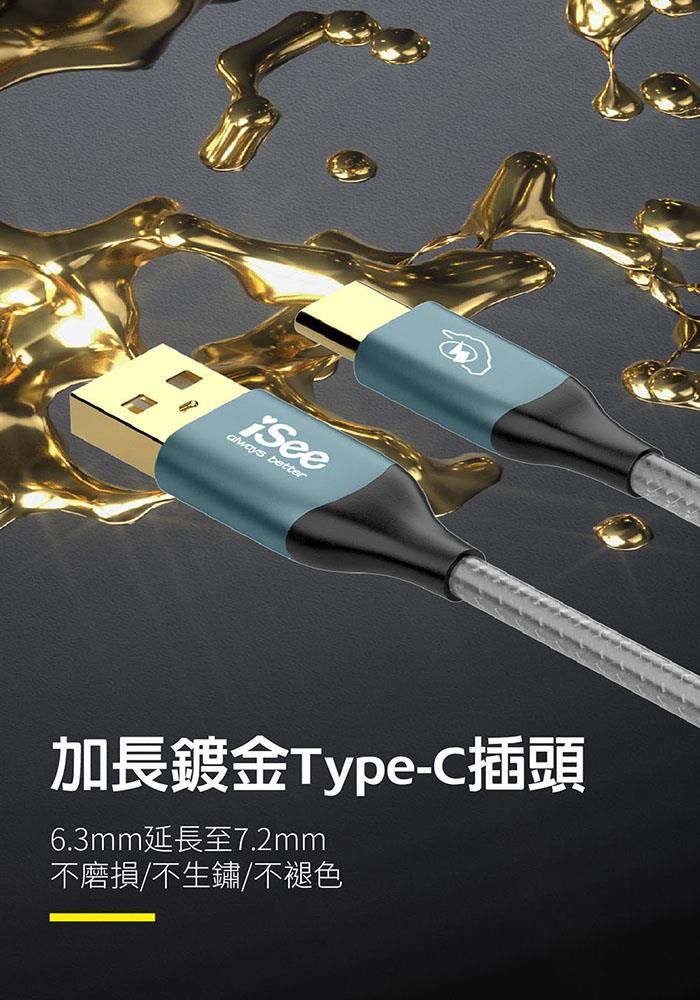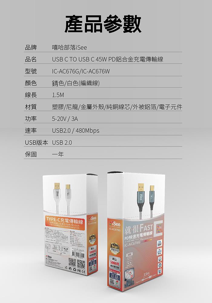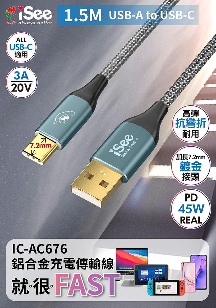 【iSee】USB-C to A 45W PD鋁合金充電傳輸線1.5M(IC-AC676)