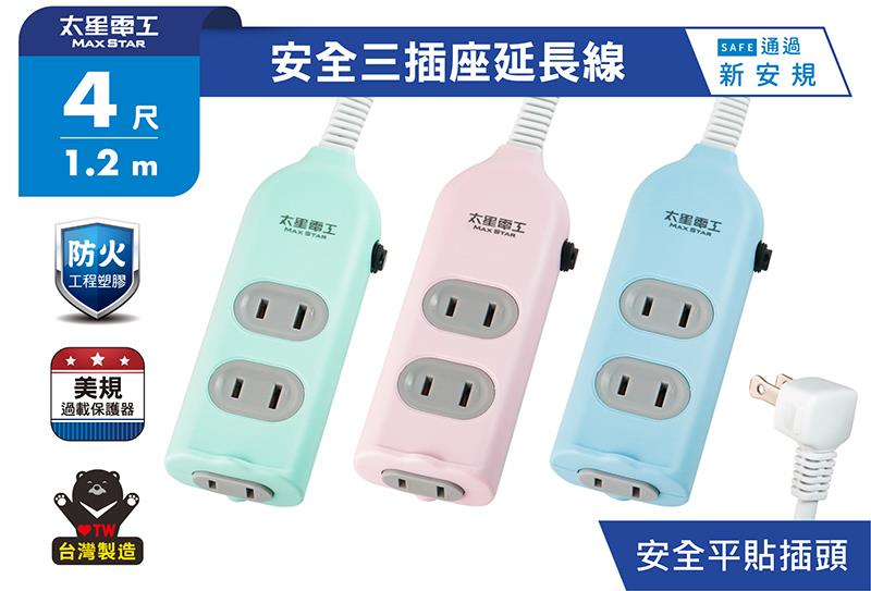 安全三插座延長線2P/15A/4尺 OCU30204