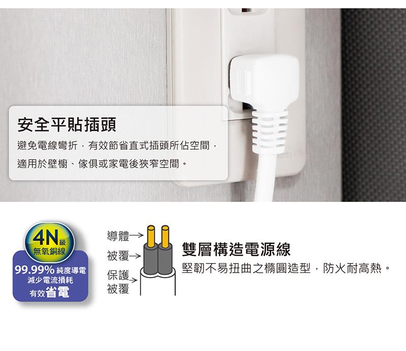 3.安全平貼插頭,避免電線彎折,有效節省直式插頭所佔空間,適用於壁櫥、 傢俱或家電後狹窄空間。