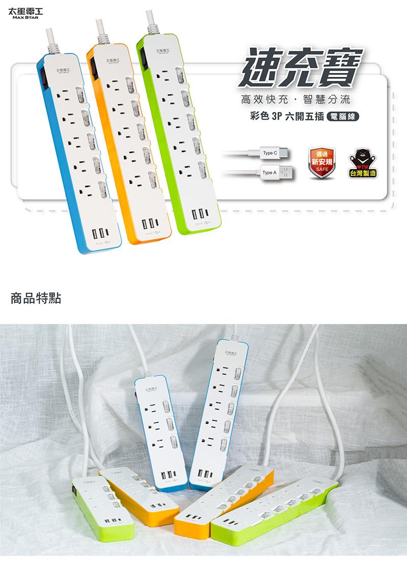 (A+B任選優惠)【太星電工】速充寶3.4A 3USB 六開五插電腦線3P/6尺+安全三插座延長線2P/15A/4尺