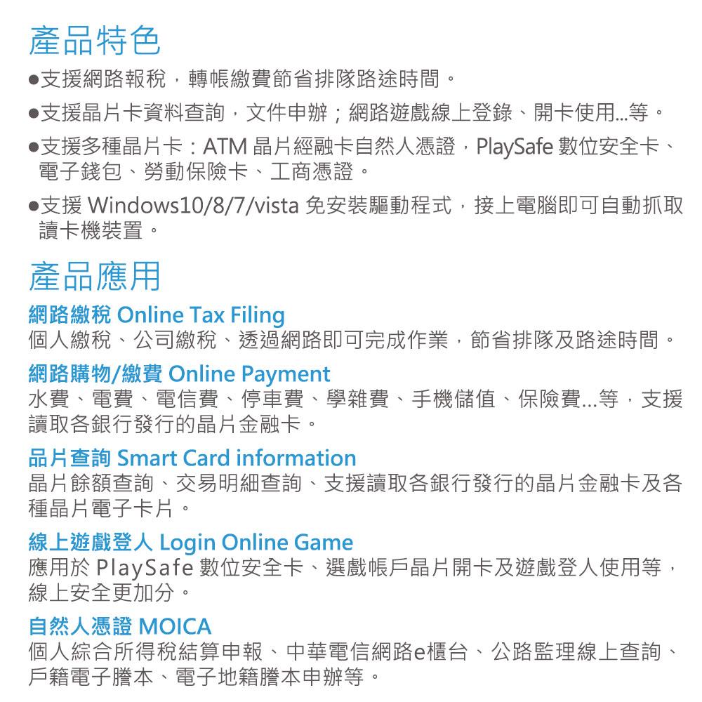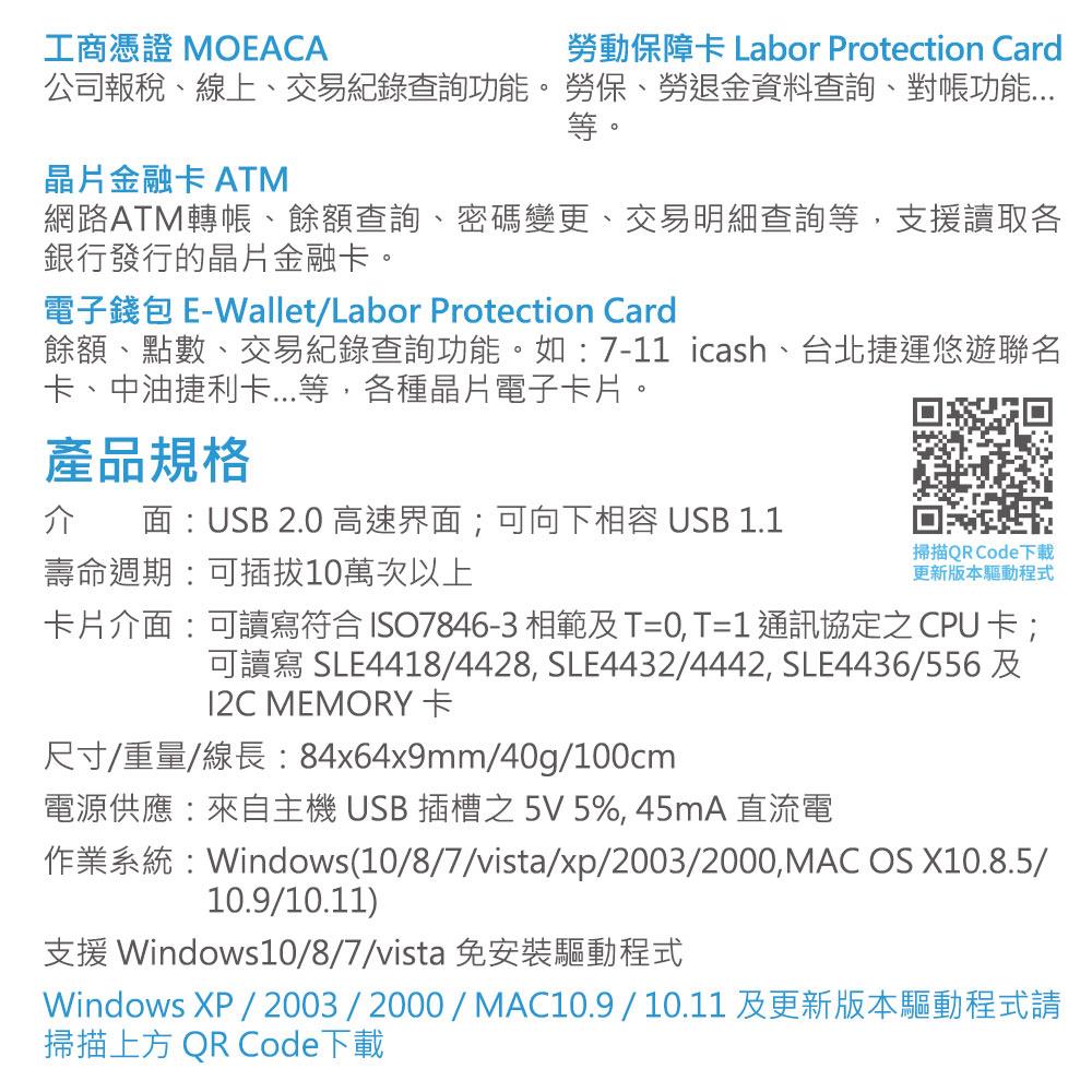 ● 支援多種晶片卡:包括ATM 晶片金融卡、自然人憑證卡、電子錢包、工商憑證等