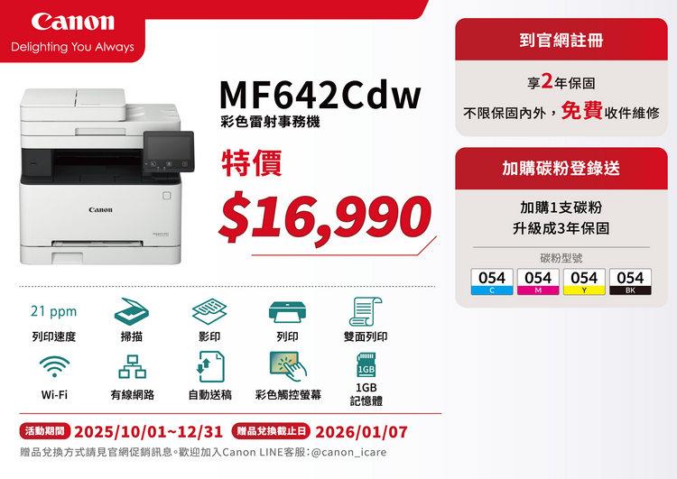 Canon imageCLASS MF642Cdw 彩色雷射多功能複合機+CRG-054H(一黑三彩)高容量碳粉匣