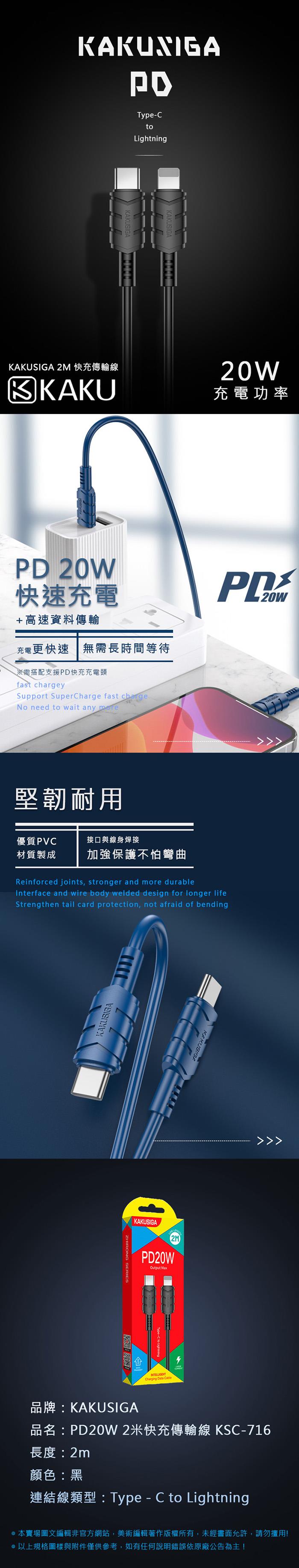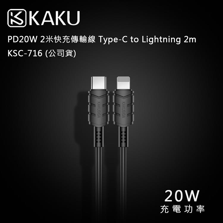 KAKUSIGA PD20W 2米快充傳輸線 Type-C to Lightning 2m -KSC-716 (公司貨)