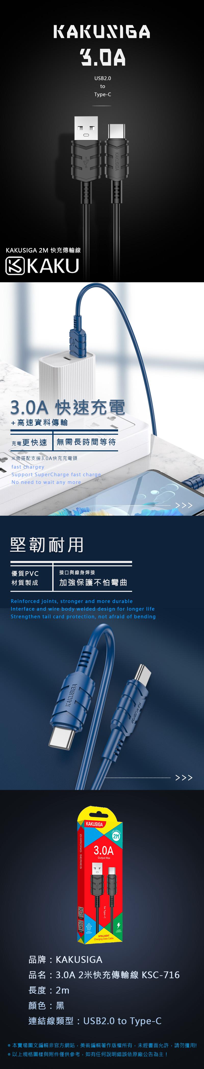 KAKUSIGA 3.0A 2米快充傳輸線 USB2.0 to Type-C 2m -KSC-716 (公司貨)