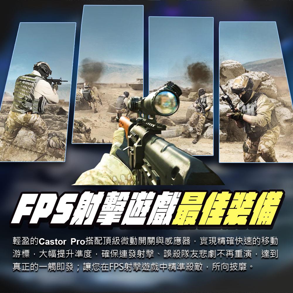 輕盈的Castor Pro搭配頂級微動開關與感應器,實現精確快速的移動游標,大幅提升準度,確保連發射擊、誤殺隊友悲劇不再重演,達到真正的一觸即發;讓您在FPS射擊遊戲中精準殺敵,所向披靡。