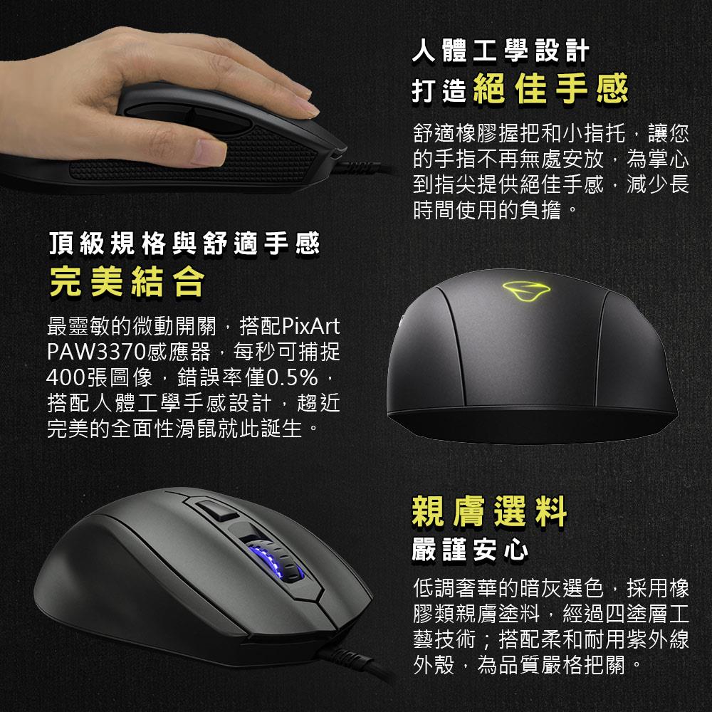 最靈敏的微動開關,搭配PixArt PAW3370 感應器,每秒可捕捉400張圖像,錯誤率僅0.5%,搭配人體工學手感設計,趨近完美的全面性滑鼠就此誕生。
