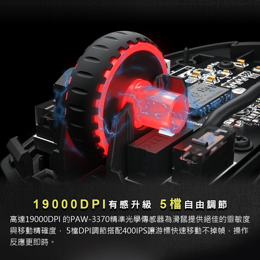 高達19000DPI 的PAW-3370精準光學傳感器為滑鼠提供絕佳的靈敏度與移動精確度, 5檔DPI調節搭配400IPS讓游標快速移動不掉幀,操作反應更即時。