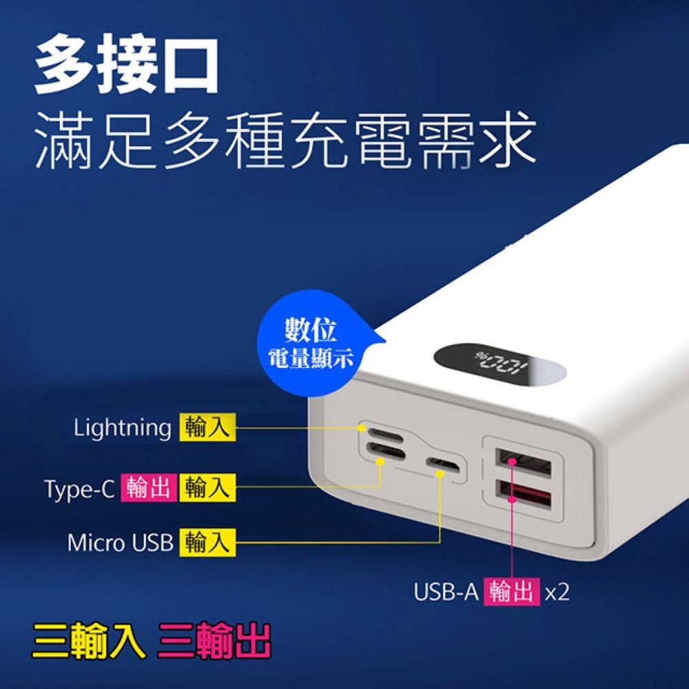 注意:此款行動電源,有 TypeC、Micro、Lightning 三個孔位作行動電源入電,可用家中任何一款充電線材,故商品內容物"不含充電線"。
