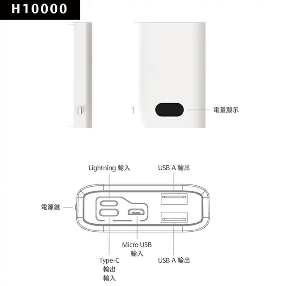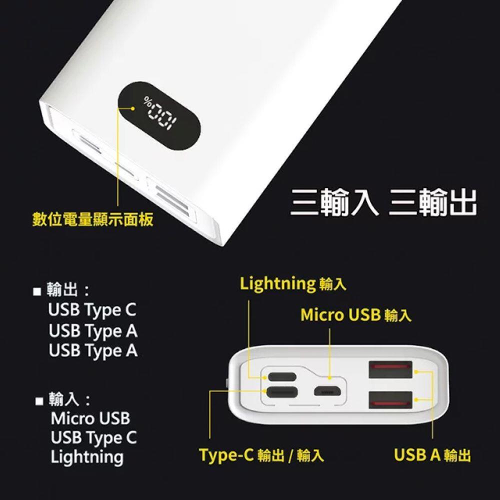 注意:此款行動電源,有 TypeC、Micro、Lightning 三個孔位作行動電源入電,可用家中任何一款充電線材,故商品內容物"不含充電線"。