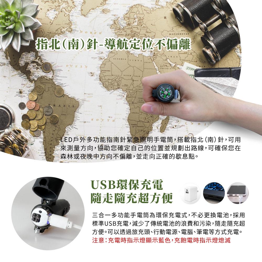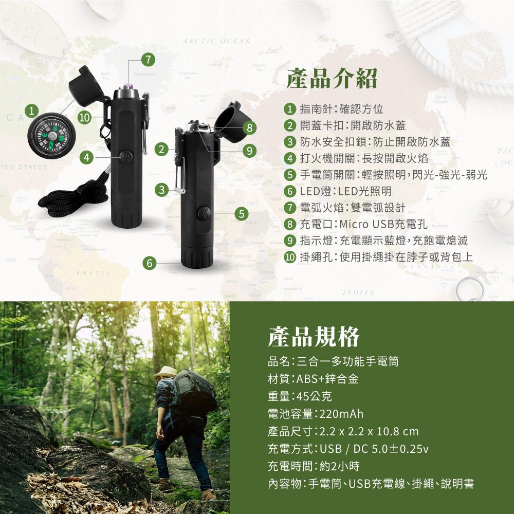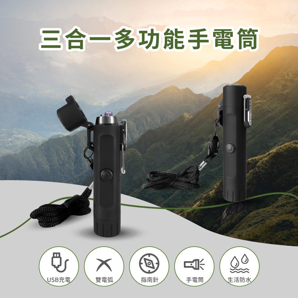 三合一多功能手電筒(USB充電/雙電弧打火機/指南針定位/LED緊急照明燈)