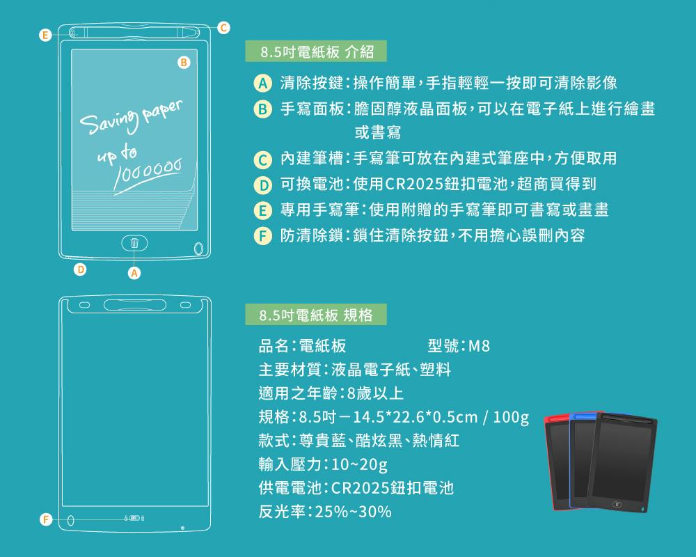 內容物:8.5吋液晶電子紙手寫板x1、手寫筆x1
