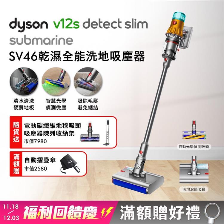 Dyson戴森 V12s Submarine乾濕全能洗地吸塵器【送收納架+地毯吸頭+自動摺疊傘】