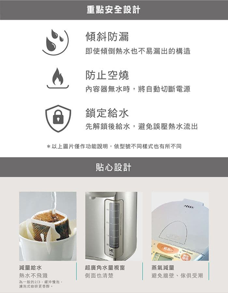 安全裝置:防止空燒/防止傾斜時熱水溢出/上蓋2段式開啟設計
