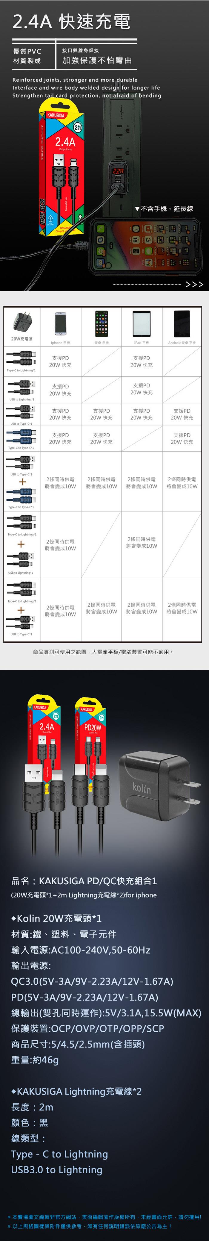 KAKUSIGA PD/QC快充組合1 (20W充電頭+2m Lightning充電線2條) for iphone