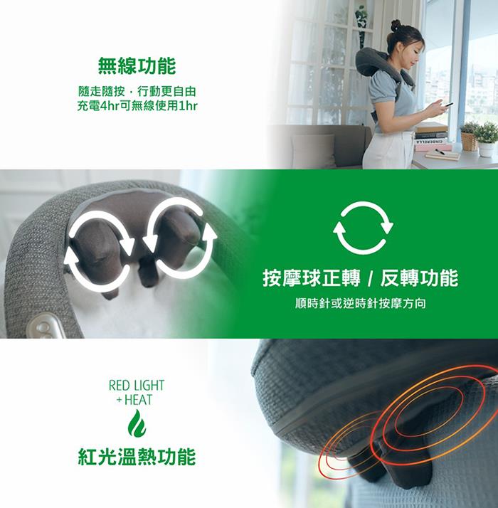 ●仿真人手指壓 ●3段按摩強度等級 ●無線操作 ●可拆除水洗頸套 ●6個按摩頭作針對性舒緩 ●可調節背帶長度,改為免手持 ●多部位按摩(肩頸