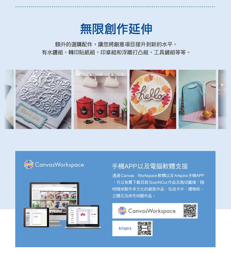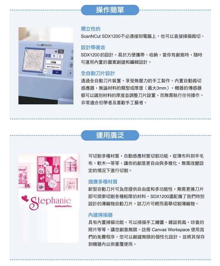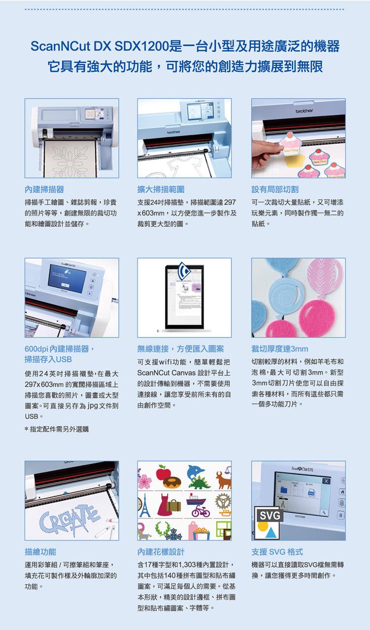 ◆內建600dpi掃描器的創意裁切機,可裁切異材質 ◆內建1,303款花樣及17款字型 ◆內置自動裁切感應器 ◆裁切厚度可達3mm