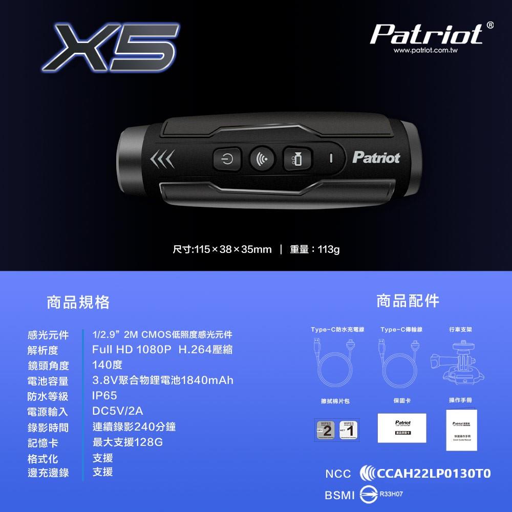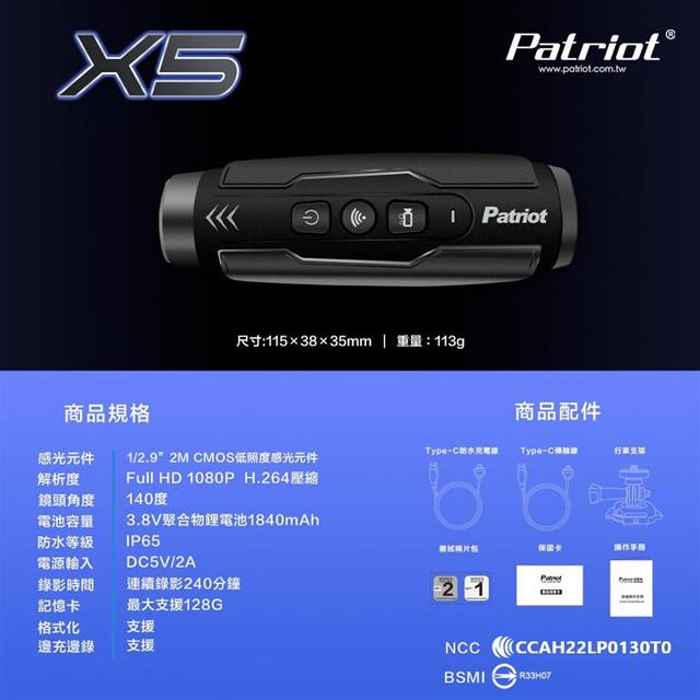 【Patriot愛國者】 X5 FHD1080P WiFi雙鏡頭行車記錄器-1年安心保固(內附32G記憶卡)專屬愛國者香氛卡