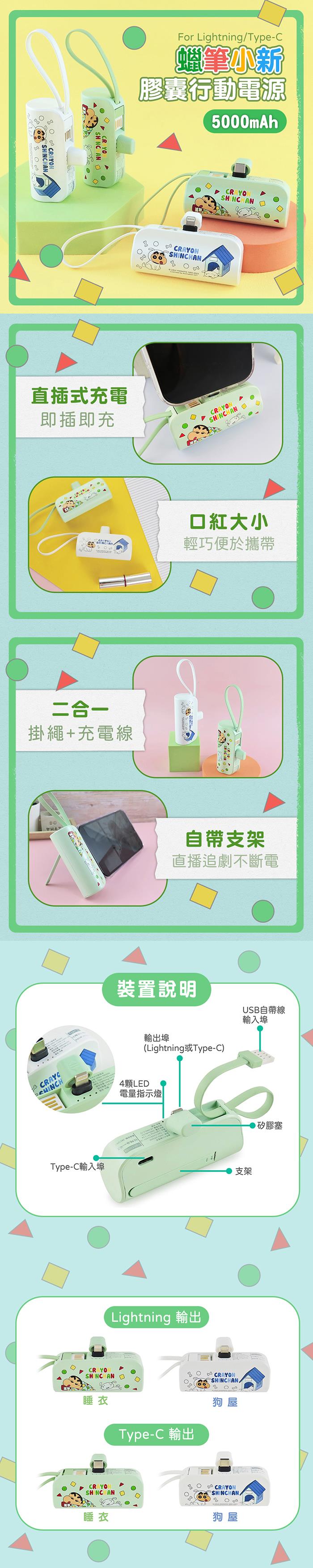 【正版授權】蠟筆小新 Type-C 膠囊支架口袋行動電源 5000mAh 直插式行動電源 睡衣(綠)