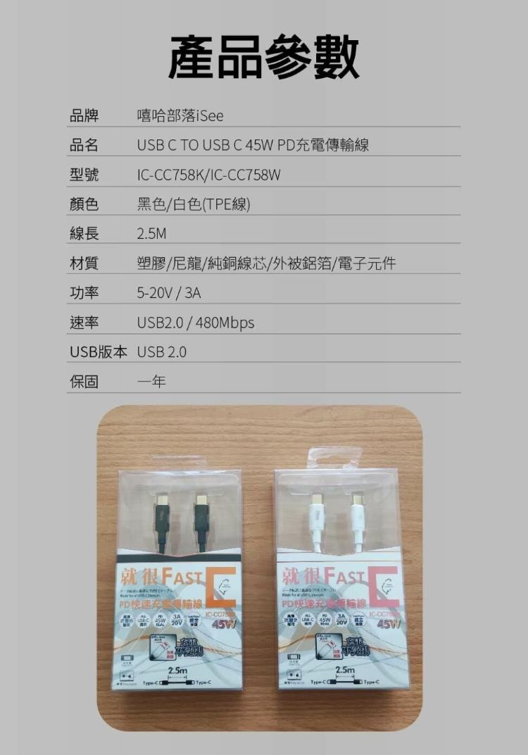 iSee USB-C to C 45W PD鋁合金充電傳輸線2.5M-黑 IC-CC758K