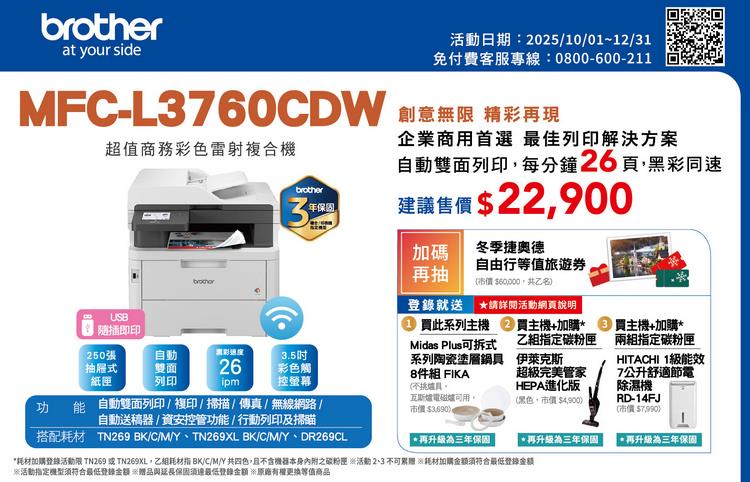 Brother MFC-L3760CDW 超值商務彩色雷射複合機