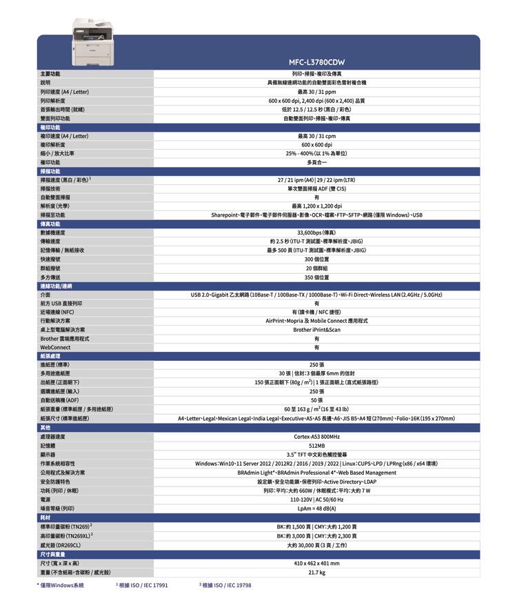 .列印 / 掃描 / 複印 / 傳真.自動雙面列印、USB直接列印.3.5吋 中文彩色LCD觸碰螢幕