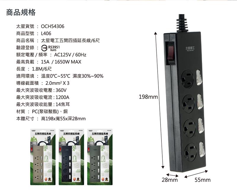 【太星電工】五開四插延長線/6尺(混色) OCH54306