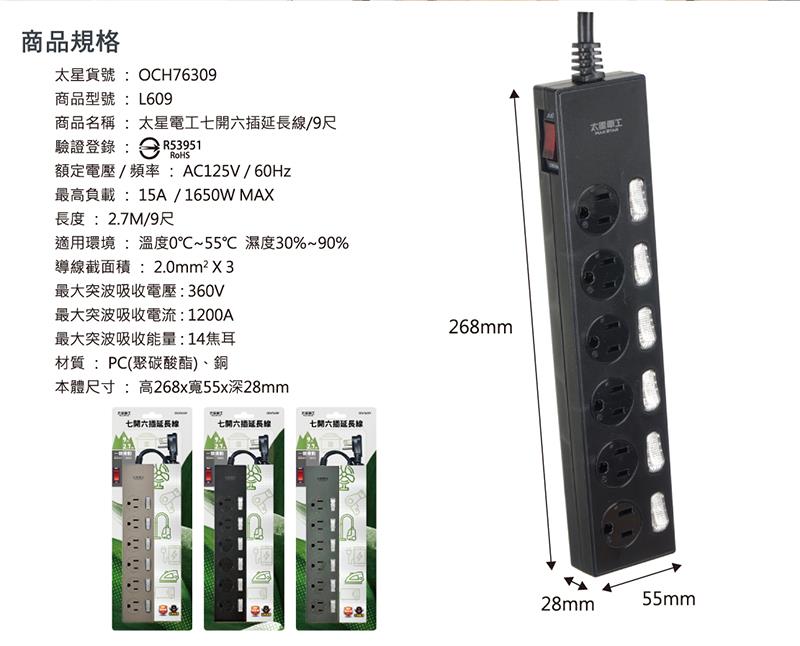 【太星電工】七開六插延長線/9尺(混色) OCH76309
