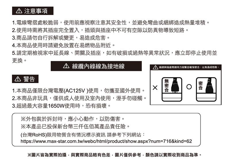1.本商品僅限台灣電壓(AC125V )使用,勿攜至國外使用。