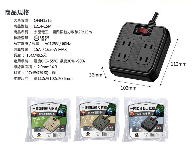 【太星電工】一開四插動力軟線2P15A/15米(混色) OFB41215