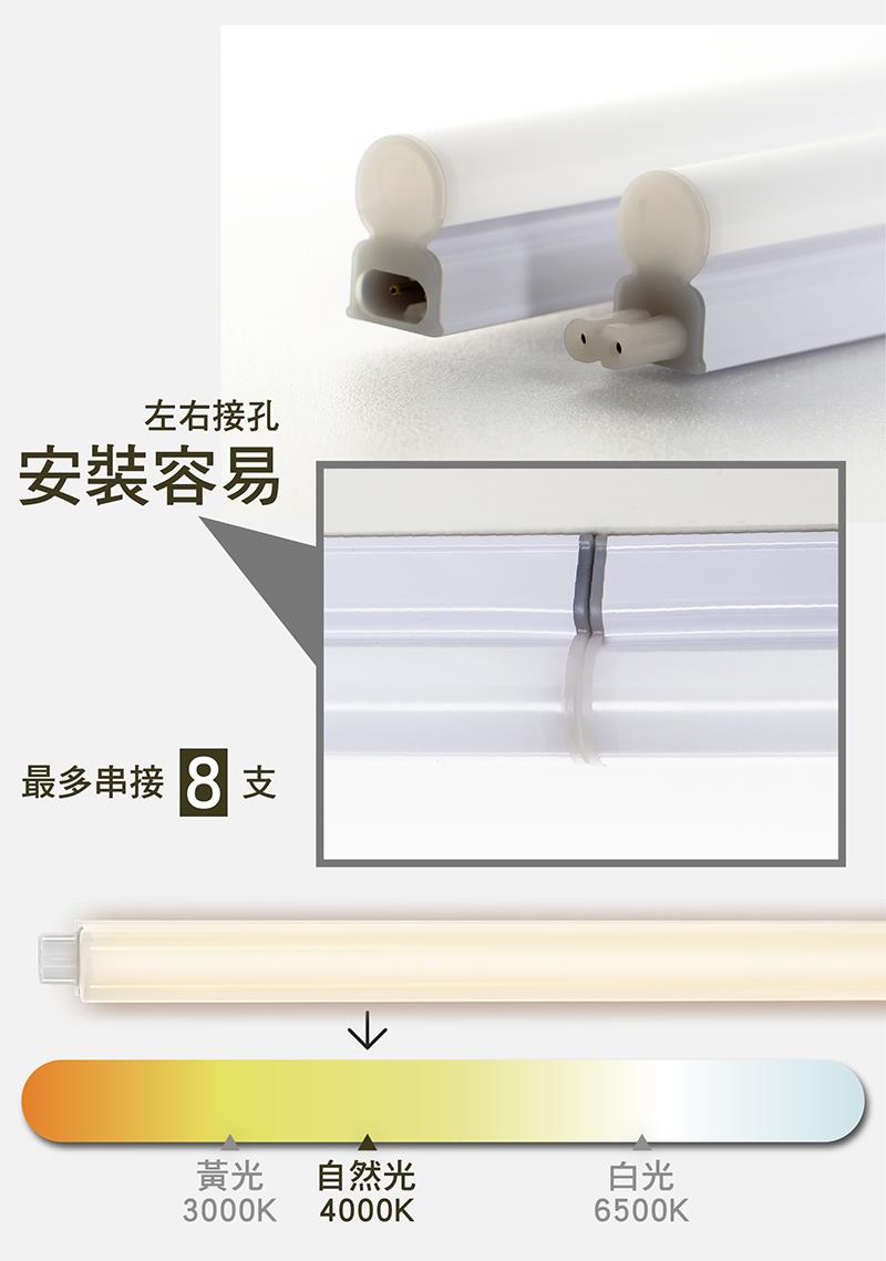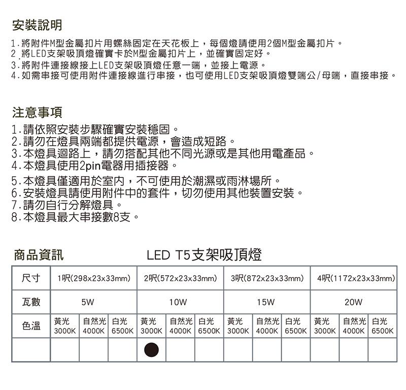 通過CNS認證,品質安全有保障安裝容易,最多可串連8支取代傳統燈管20W3種色溫供選擇,家用、餐廳、廚房等適用