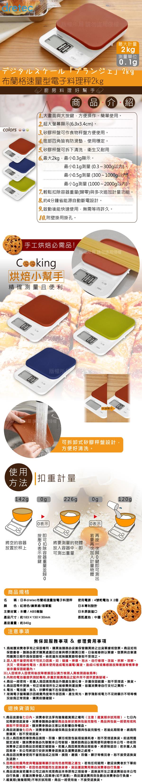 【日本dretec】「布蘭格」速量型電子料理秤-海軍藍-2kg/0.1g(KS-716NV)