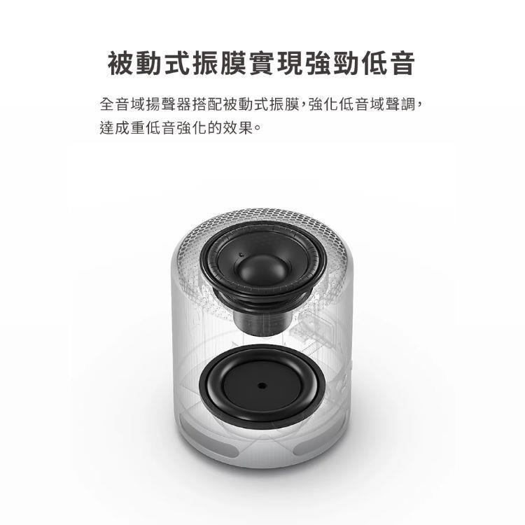 ● 強力重低音: 被動式振膜搭配全音域揚聲器,即便機身小巧也可輸出強勁的重低音效果。