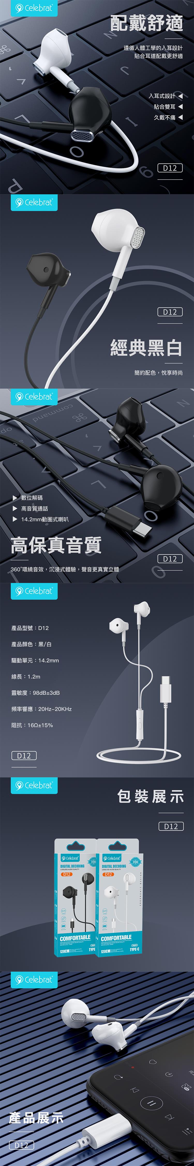 Celebrat D12 TYPE-C 耳塞式可通話耳機 - 2色