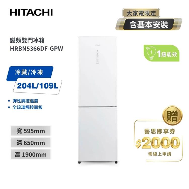 【HITACHI 日立】313L 一級能效變頻右開雙門冰箱-琉璃白 (HRBN5366DF-GPWTW)