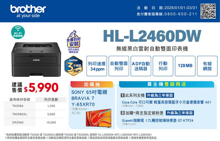 *耗材加購登錄活動限TN-2560及TN-2560XL
