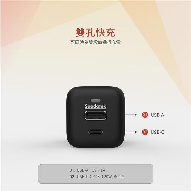 Type-C口支援20W充電、折疊式插頭,方便攜帶、台灣BSMI認證通過、可同時充電兩台設備、支援PD快充協議