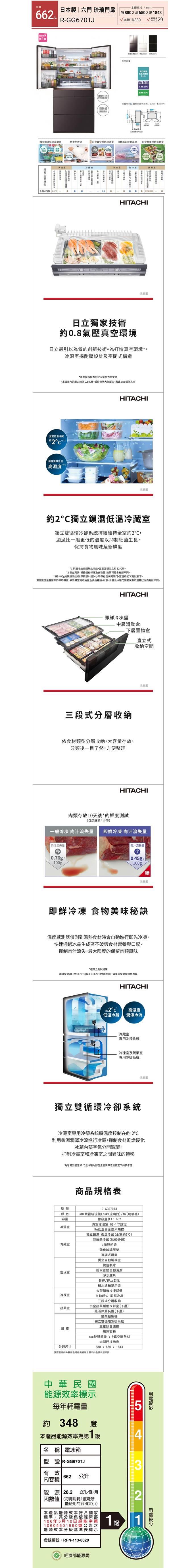 【HITACHI 日立】662L 日本製 一級節能 六門琉璃冰箱 RGG670TJ XM紫霧琉璃鏡/XK琉璃黑/XW琉璃白