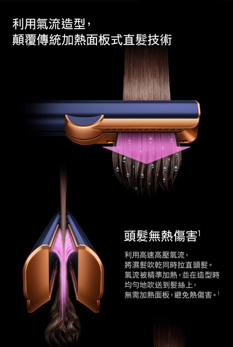 1. 全新氣流科技:顛覆傳統加熱是直髮器,利用高速氣流,以45度角向下精準輸出,吹乾並拉直頭髮